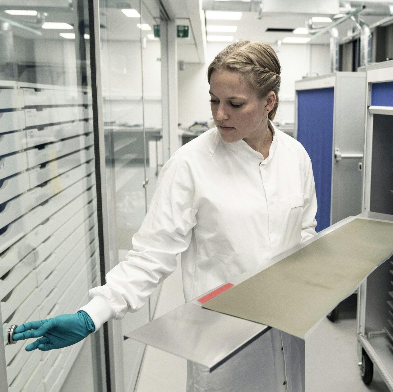 Here is Anne Lyck Smitshuysen with one of the large electrolysis cells, which is physically a large flat square. Photo: Mathias Svold / Ritzau Scanpix